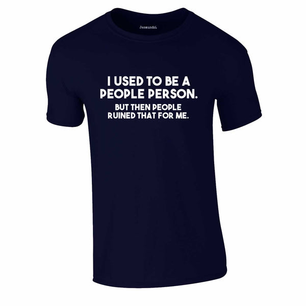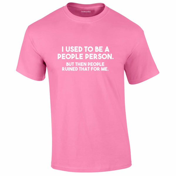 The whole slogan reads I used to be a people person but then people ruined that for me. This is one of our funniest t-shirts that will get a lot of laughs from anyone who reads it.